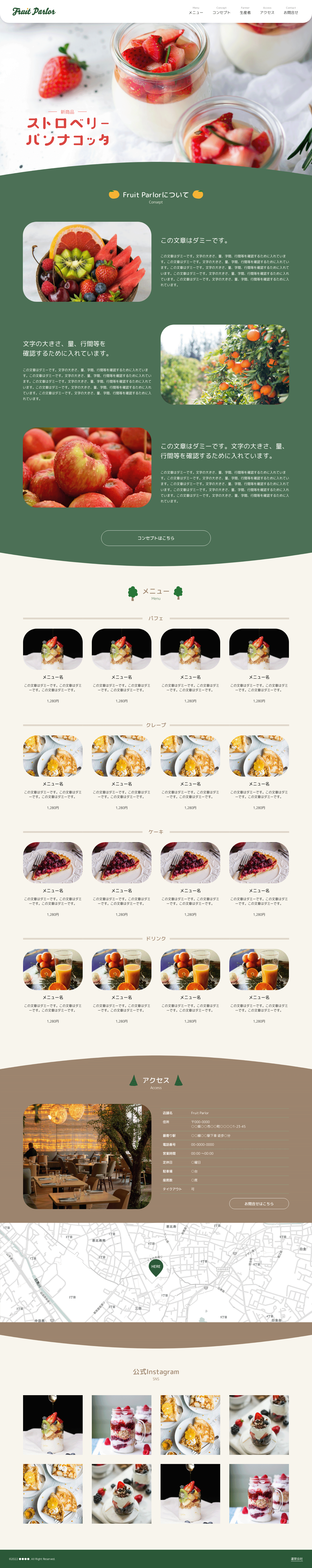 自然派なカフェをイメージし、グリーンやブラウンなどのネイチャーカラーをベースにデザインしました。フルーツのみずみずしさを伝えるために写真を多く配置できるよう構成しています。